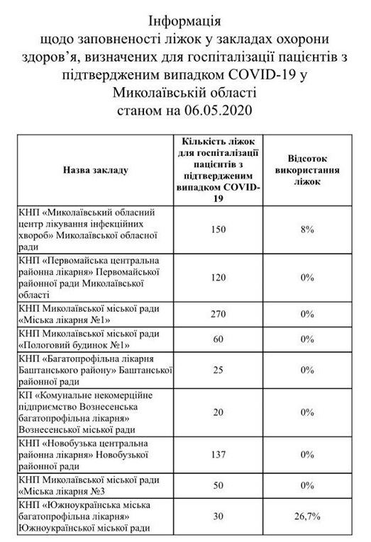 Койки для коронавирусных больных в медучреждениях Николаевской области заполнены меньше чем на 3%