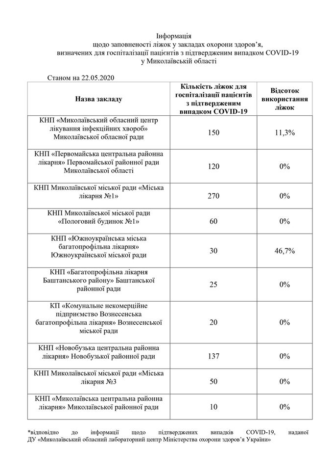 В Николаевской области состоянием на 22 мая только в 2 из 10 больниц определенных для госпитализации больных у которых диагностирован коронавирус, есть пациенты с COVID-19.