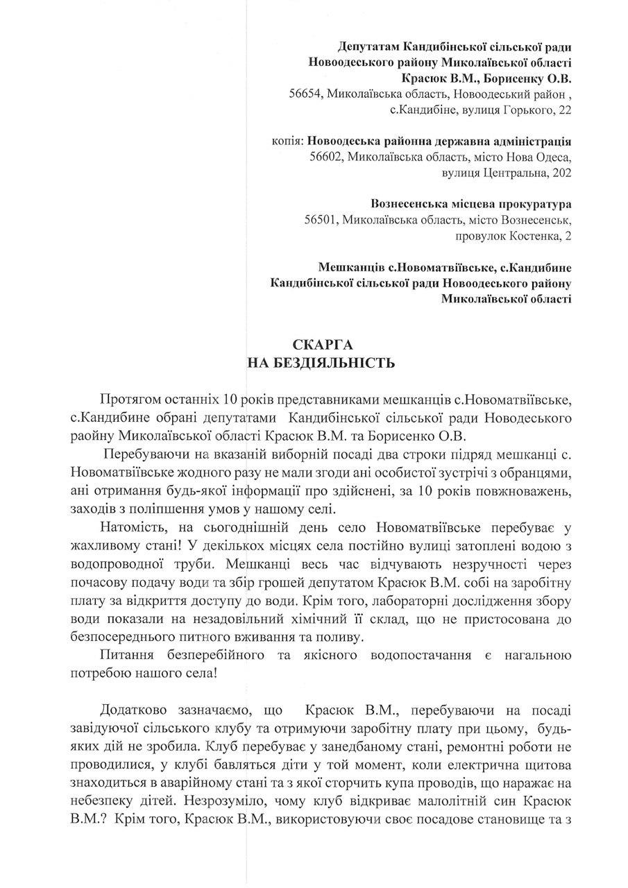 — На сегодняшний день село пребывает в ужасном состоянии! Улицы постоянно затоплены водой из водопроводной трубы. Жители все время чувствуют дискомфорт из-за почасовой подачи воды, а также сбора денег депутатом Верой Красюк за открытие доступа к воде. Кроме того, лабораторные исследования сбора воды показали неудовлетворительный химический состав. Вода непригодна к употреблению и использованию в поливе, - сказано в сообщении.