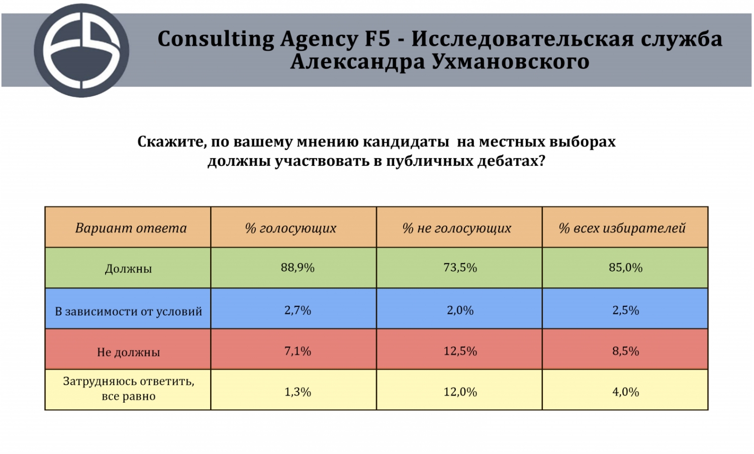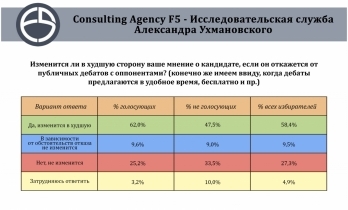 Помимо этого, авторы исследования выяснили, как отказ от дебатов повлияет на мнение общества о кандидатах. Так, 58,4% избирателей изменят свое мнение о кандидате в худшую сторону, если он откажется от дебатов. Не изменится мнение о кандидате у 27,3% избирателей.