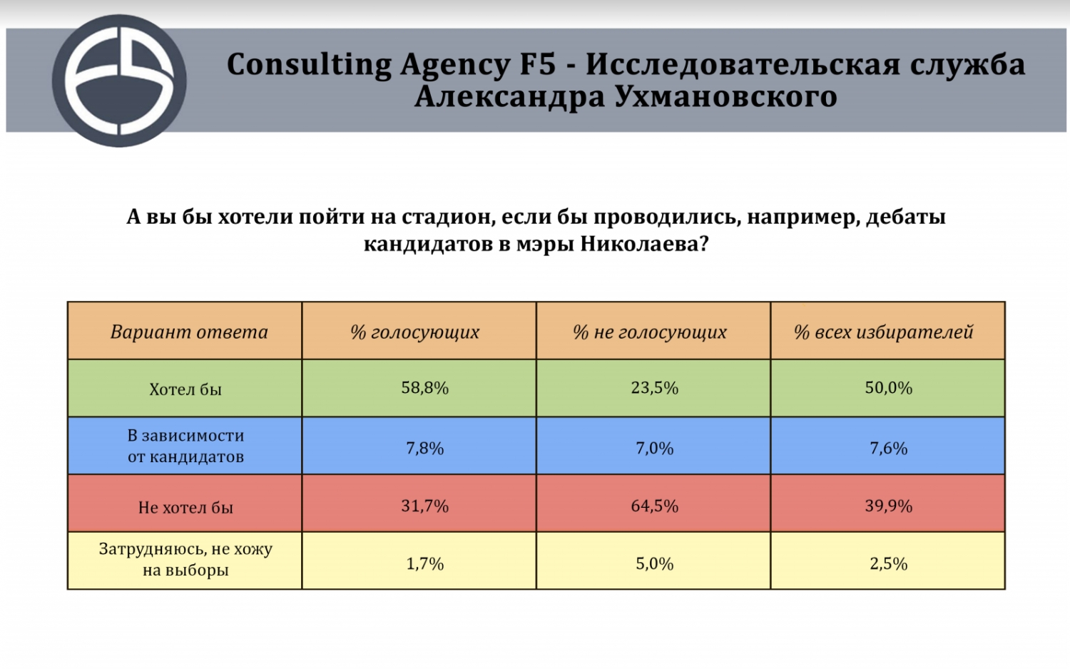 На вопрос: «Хотели бы вы пойти на стадион, если бы проводились дебаты кандидатов в мэры?», 50% избирателей дали положительный ответ. Не пришли бы на дебаты 39,9% опрошенных избирателей.