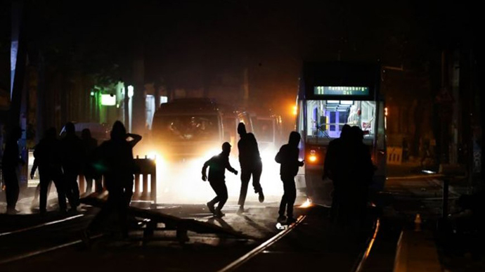 По данным полиции, люди в масках забросали брусчаткой и кирпичом полицейский участок и прибывшие экстренные службы, подожгли мусорные баки и установили горящие баррикады на рельсах трамвая.