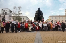 После этого протестующие пенсионеры выстроились в цепь солидарности на Октябрьской площади, а затем пошли к площади Победы.