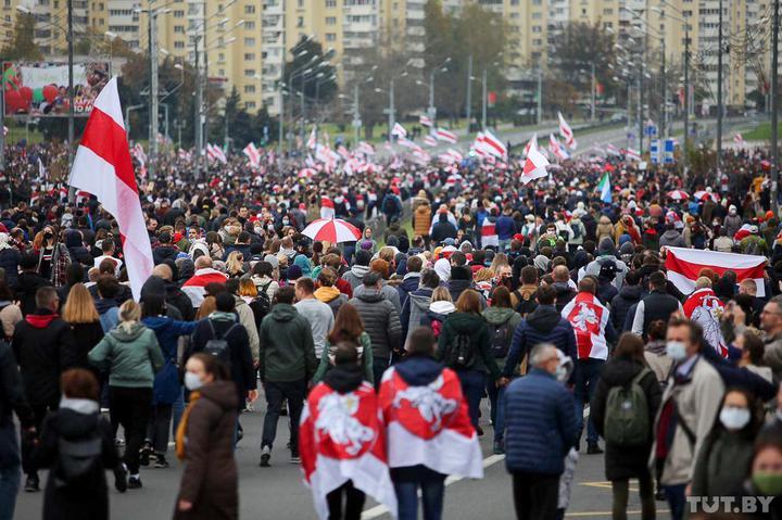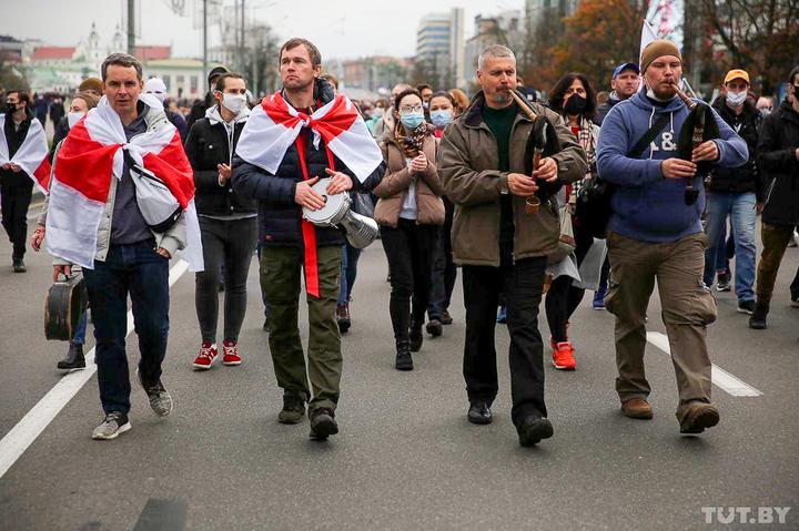 Параллельно в некоторых районах белорусской столицы выстраиваются цепи солидарности. Многотысячная колонна собралась у ратуши и двинулась в сторону стелы, несмотря на то, что центр уже с утра во многих местах патрулировали силовики.