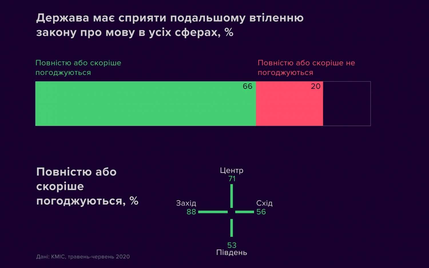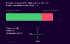 66% украинцев считают, что государство должно способствовать дальнейшему воплощению закона о языке во всех сферах, не разделяют этого мнения 20%. Поддержка закона о языке преобладает во всех регионах Украины — от 88% на Западе до 53% на Юге.