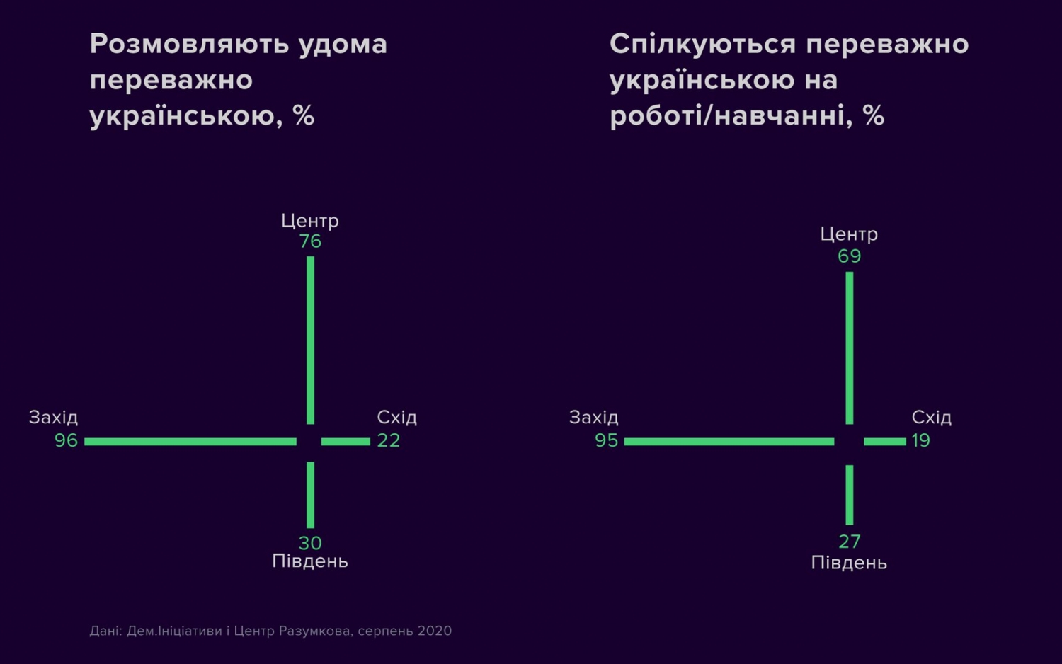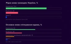 Русский язык полностью доминирует и в украинском интернет-пространстве. Например, в Киеве доля использования украинского языка в соцсетях составляет лишь 16%. Только в 4 областях украинский язык немного преобладает над русским в соцсетях.