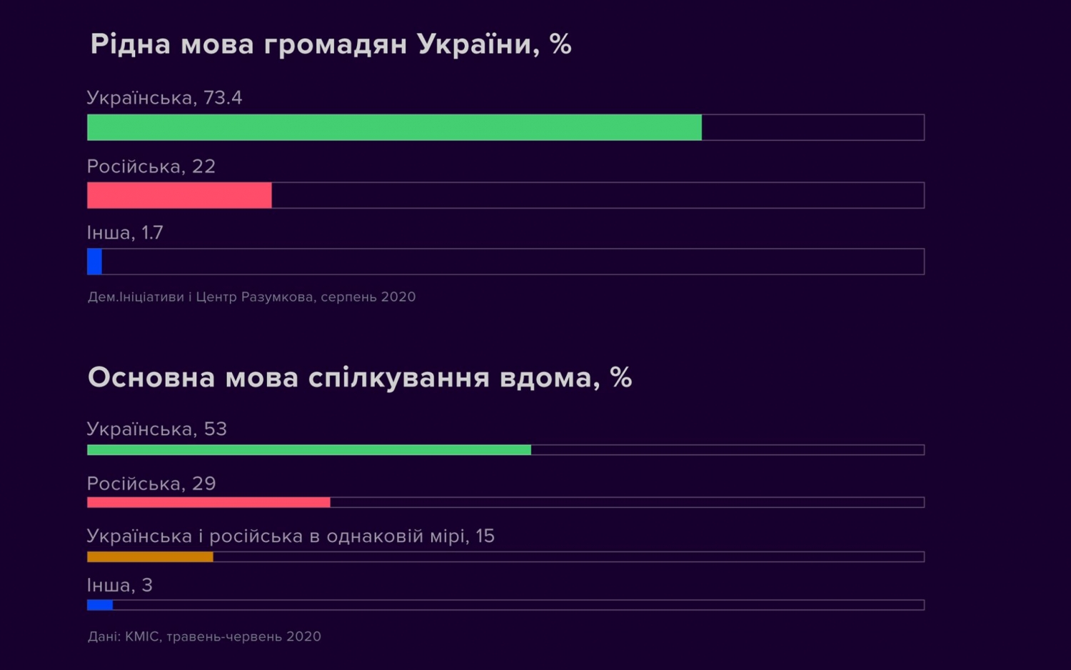73% украинцев считают украинский язык родным. 53% граждан Украины общаются дома преимущественно на украинском, 29% — на русском.