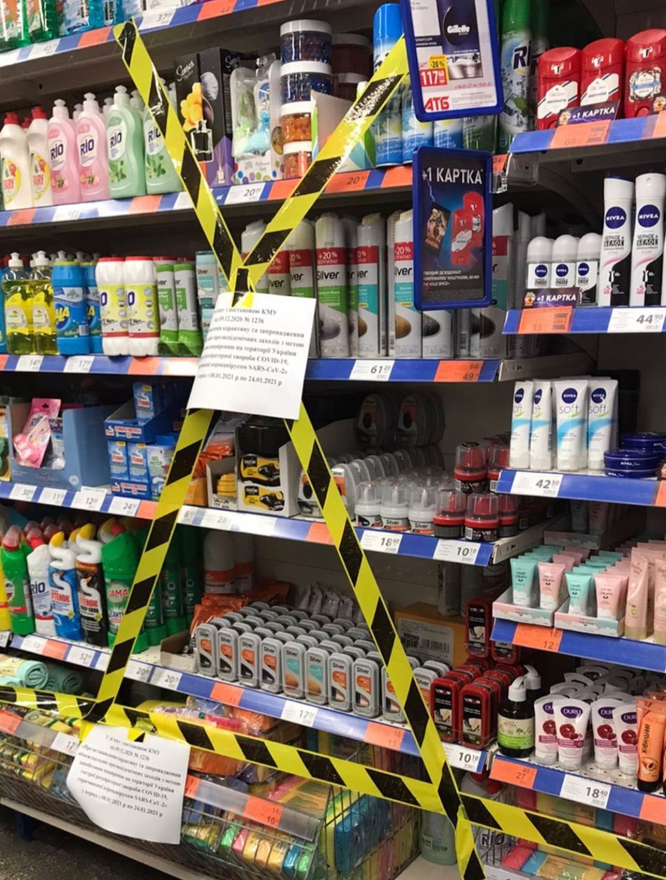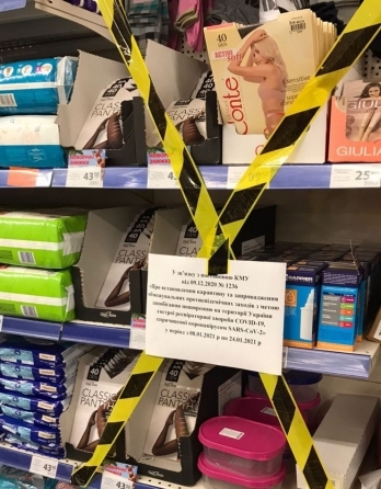 В частности, администрации супермаркетов огородили лентами полки с хозяйственным товаром, бельем и канцтоварами. При этом, к каждому стеллажу прикреплен информационный лист, в котором покупателям объясняют, что данные меры были приняты в связи с постановлением Кабмина от 9 декабря 2020 года о введении в Украине жесткого карантина.