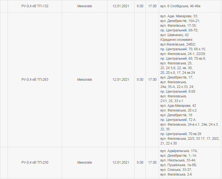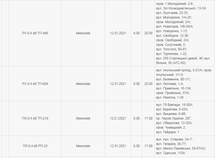 Полный перечень адресов, которых коснется отключение электроэнергии, опубликован на сайте «Николаевоблэнерго».