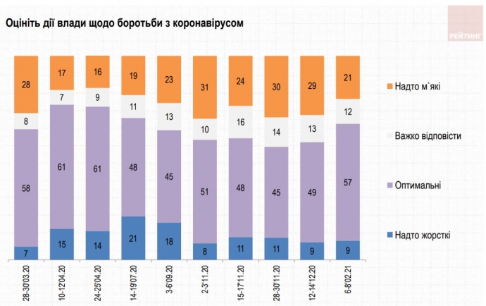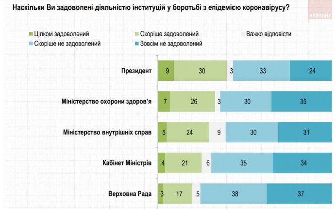 В частности, 39% опрошенных довольны деятельностью президента в борьбе с коронавирусом (57% — недовольны). Деятельностью Министерства здравоохранения довольны 33%, недовольны - 65%. Деятельностью Министерства внутренних дел довольны 29%, недовольны - 61%.