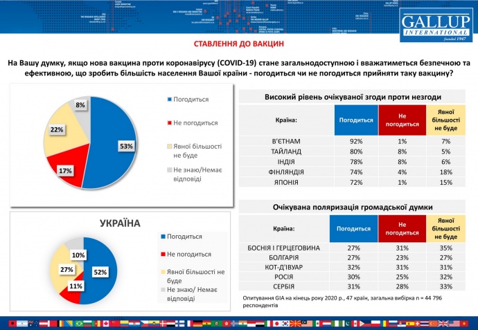 В Украине 52% считают, что их земляки будут вакцинированы. Люди в России, Восточной Европе и Африке, с другой стороны, демонстрируют неуверенность в том, что их общества готовы к вакцинации.