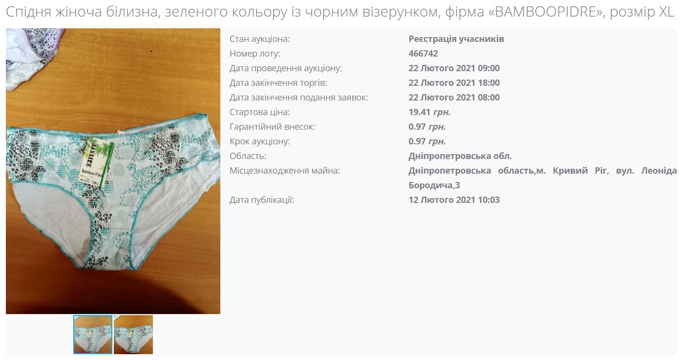 Стартовая цена женских трусов — 19 гривен 41 копейка. Белье было изъято у должника из Кривого Рога. Пока что в аукционе участия никто не принимает.