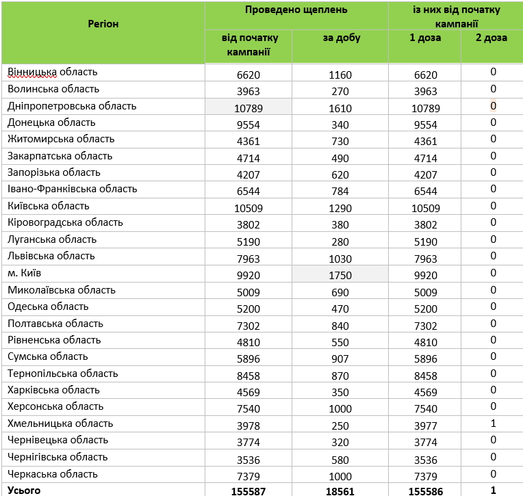 Всего за сутки в Украине против COVID-19 было привито 18 тысяч 561 человека. Всего с начала кампании вакцинации прививки получили 155 тысяч 587 человек, из которых 1 человек получил 2 дозы.