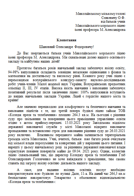 — Ученики, педагоги, родители уже много лет ждали от городской власти понимания и конкретных действий в решении этого вопроса. И, наконец-то в этом учебном году по решению государственной исполнительной службы пользователь должен вернуть имущество до 4 апреля 2021 года. Однако коллектив лицея обеспокоен тем, что директор Колледжа прессы и телевидения Глеб Александрович Головченко не хочет выезжать из помещения, тем самым ставит под угрозу качественную образовательную деятельность нашего учреждения, — сказано в обращении.