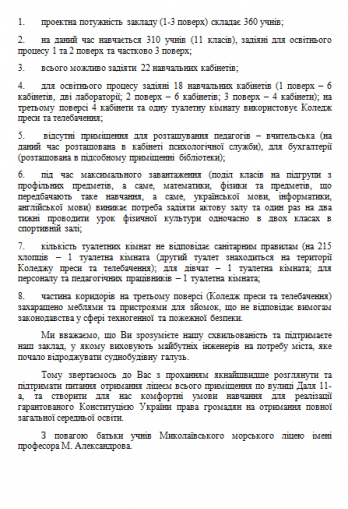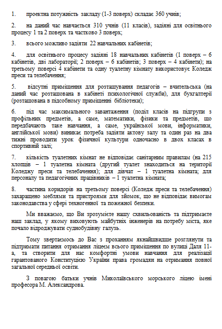 Коллектив Николаевского морского лицея имени профессора М. Александрова обратился к городскому голове Николаева Александру Сенкевичу с тем, чтобы учреждению как можно скорее передали все помещения здания по улице Даля, 11.