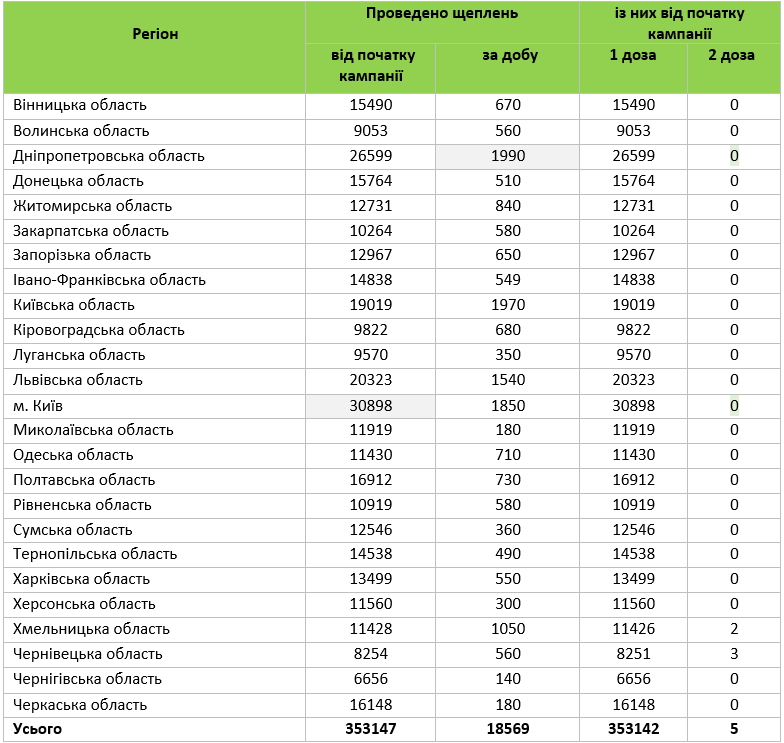 В целом по Украине за прошлые сутки вакцину получили 18 тысяч 569 человек, всего с начала периода вакцинации — 353 тысячи 141.