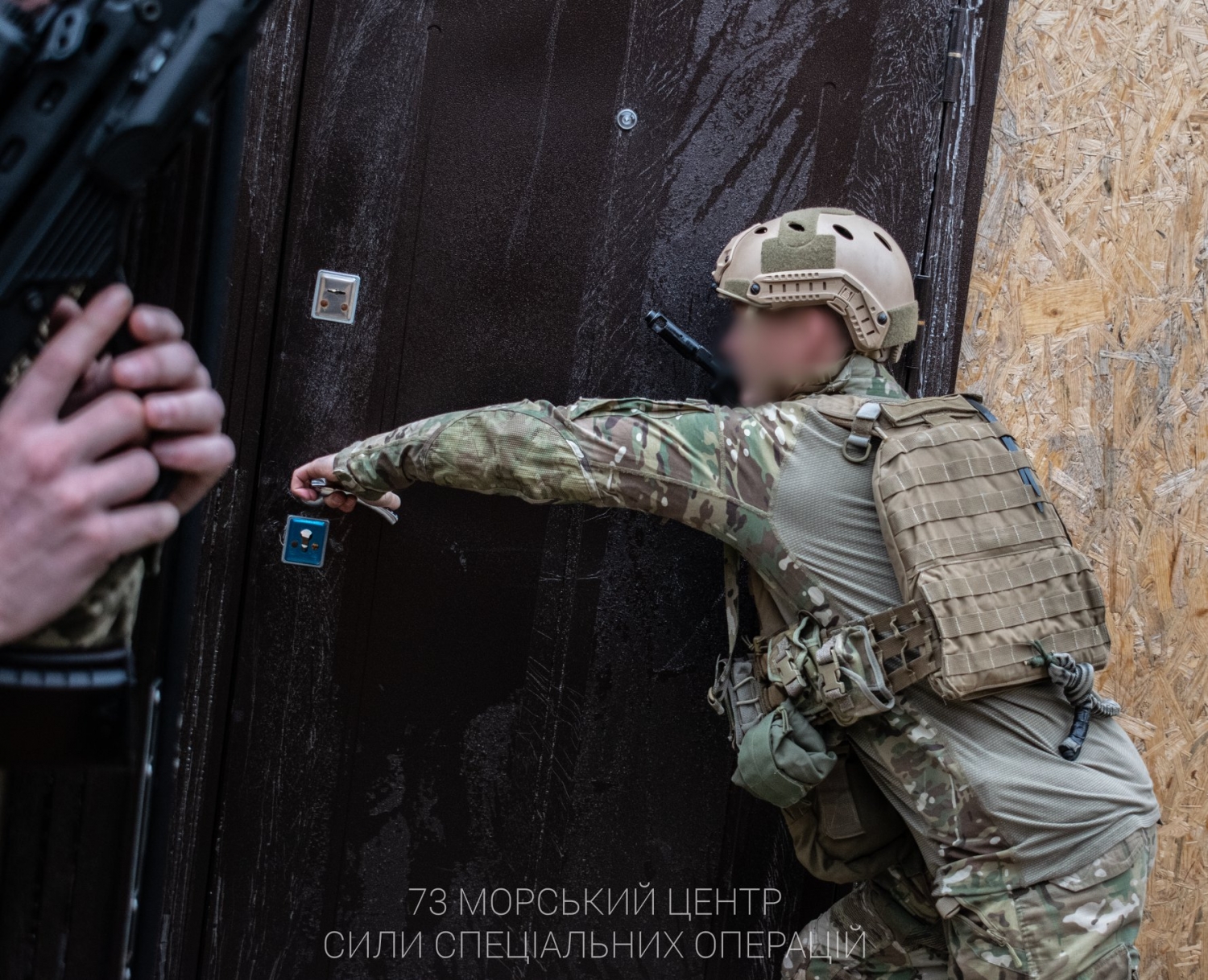 Бойцы очаковского 73-го морского центра специальных операций имени кошевого атамана Антона Головатого показали процесс учений по ближнему бою в здании.