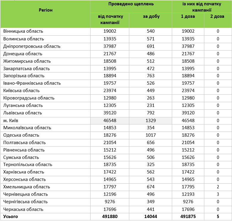 Всего с начала кампании по вакцинации проведены 491 880 прививок, вакцинировано - 491 877 человек.