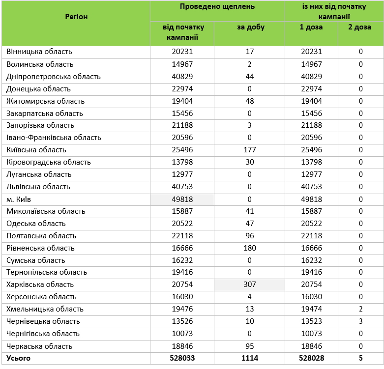 Всего с начала кампании по вакцинации первую прививку в регионе сделали 15 887 людям, всего в Украине — 528 тысяч 33 прививки.