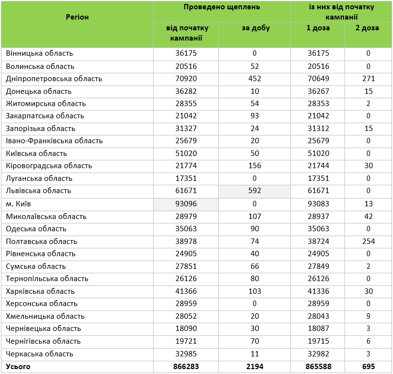 Всего в Украине с начала кампании первую дозу вакцины получили 865 588 человек, вторую - 695