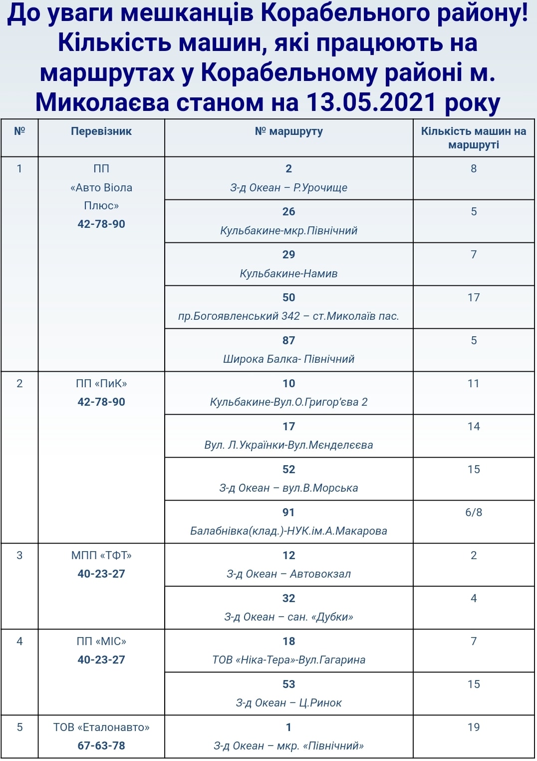Администрация Корабельного района Николаева опубликовала данные о количестве маршруток которые обслуживают район по состоянию на 13 мая.