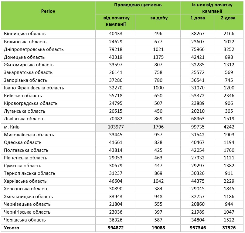 Всего с начала кампании по вакцинации проведены 994 872 прививок. Вакцинировано - 957 348 человек, из них получили первую дозу - 957 346 человек завершили вакцинацию (получили две дозы) - 37 526 человек (из них 2 человека получили первую дозу границей).