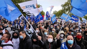Генеральный секретарь союза Альянс Фабьен Ванхемелрик свистнул с трибуны, на которой был растянут черный флаг «Платят за то, чтобы служить, а не умирать».