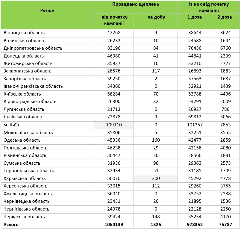 Наибольшее количество прививок сделали в Харьковской области - 300, наименьше в Запорожской области - 2. При этом ни одной прививки не сделали в Ивано-Франковской, Луганской, Киеве, Хмельницкой и Черниговской областях.