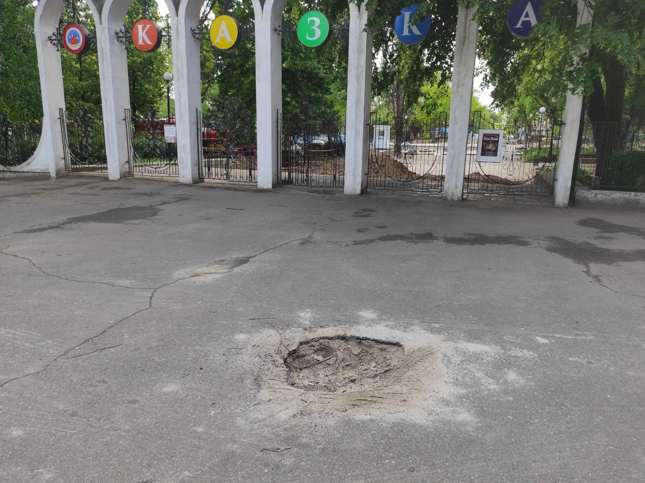 Яму, которая образовалась в асфальтном покрытии около входа в детский городок «Сказка», засыпали песком.