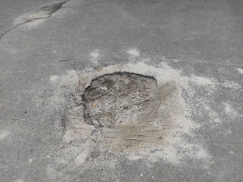 Напомним, пробоина образовалась еще в начале мая. Сначала в нее воткнули засохшее дерево, а потом огородили яму деревянным забором.