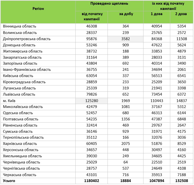 Наибольшее количество прививок сделали в Днепропетровской области - 3582, наименьше в Черновицкой области - 64.