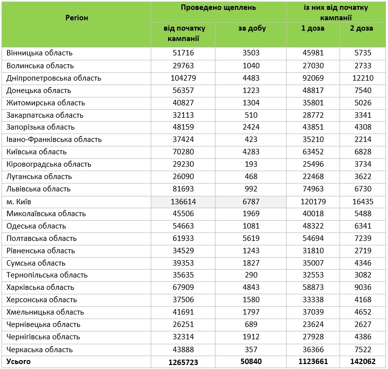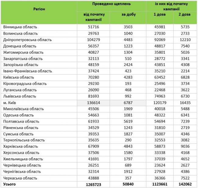 За прошедшие сутки в Украине против COVID-19 было привито 50 840 человек.