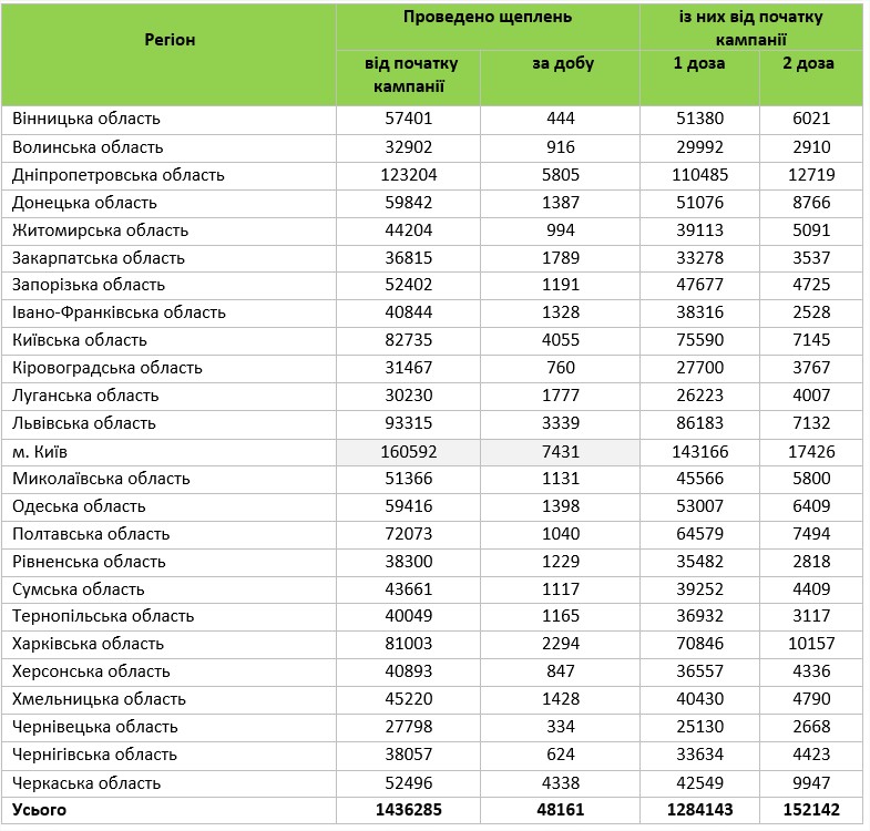 За прошедшие сутки всего в Украине от COVID-19 было привито 48 161 человека.