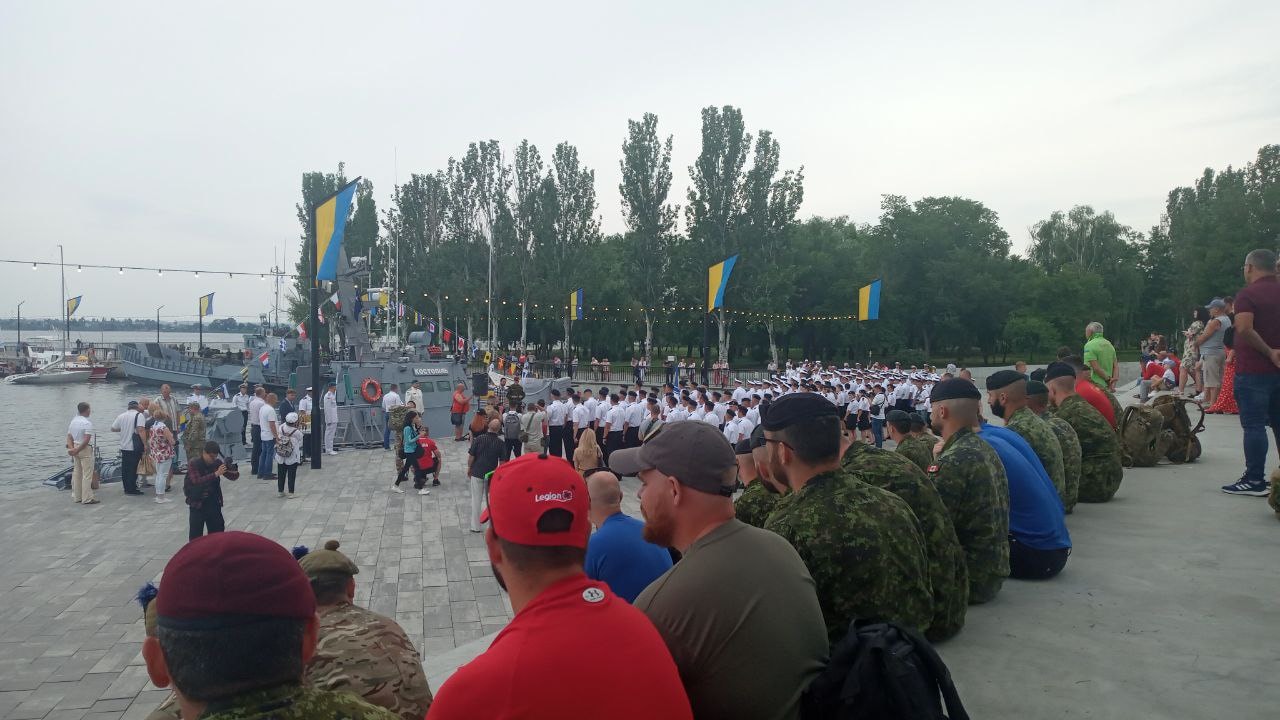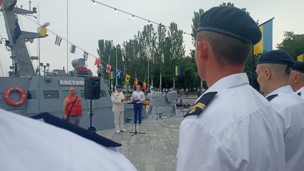 Праздничные мероприятия стартовали с построения и поднятия боевых флагов. Вчера, 3 июля, в акваторию Южного Буга зашли военные катера «Костополь» и «Сватово».