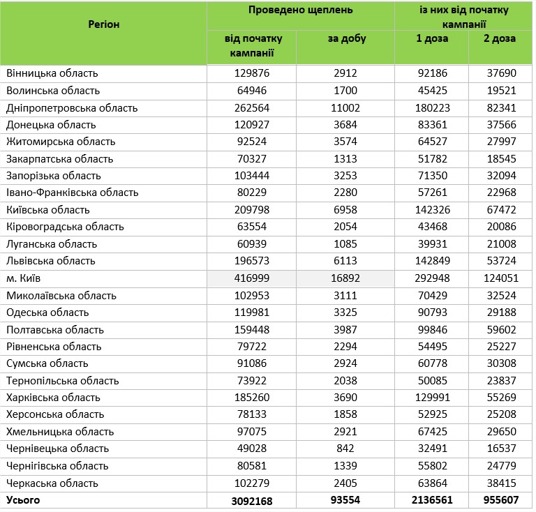 Наибольшее количество прививок сделали в Киеве — 16 892, наименьшее в Черновицкой области — 842.
