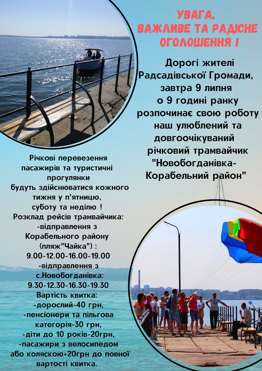 Сегодня, 9 июля, речной трамвайчик осуществил первый рейс по маршруту Новая Богдановка — Корабельный район. Отныне он будет курсировать каждую неделю в пятницу, субботу и воскресенье под флагом проекта Радсадовской ОТГ «Радсад-Велоскиф».