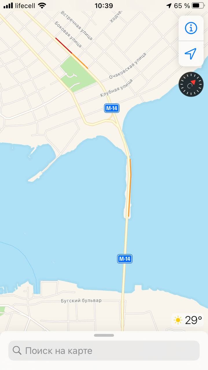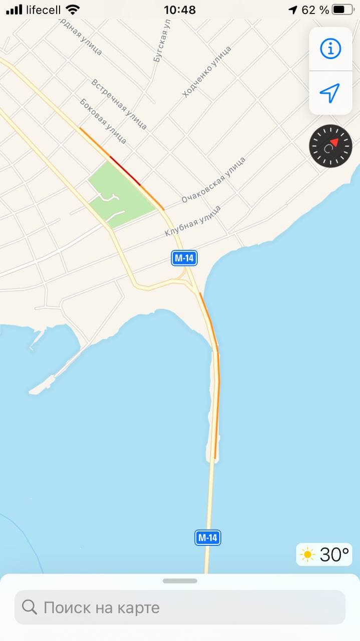 На Google-карте заметны самые загруженные участки трассы: от Очаковской улицы до Веселиновского переулка и на подъезде к мосту на въезде в Николаев.