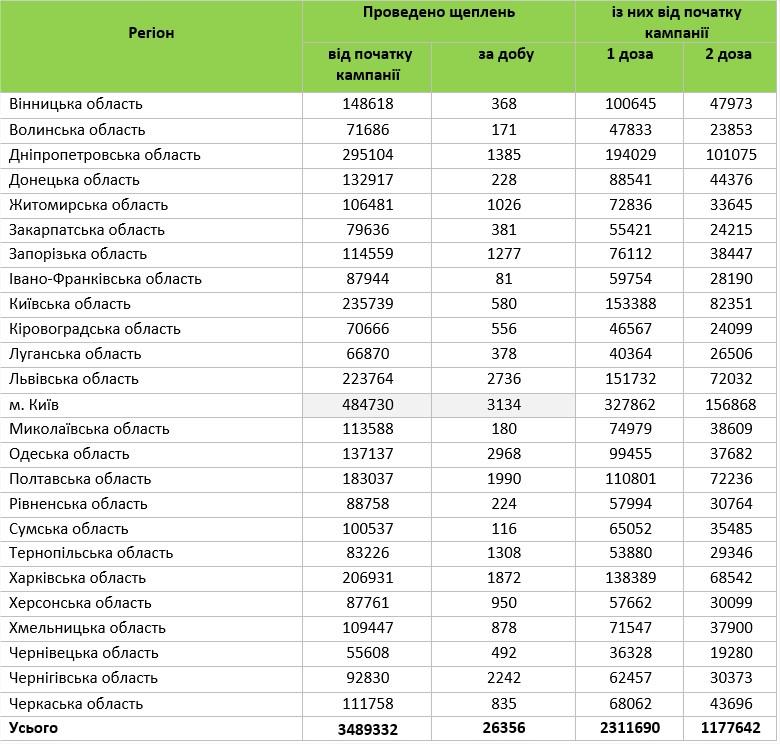 Наибольшее количество прививок сделали в Киеве — 3 134, наименьшее в Иванов-Франковской области — 81.