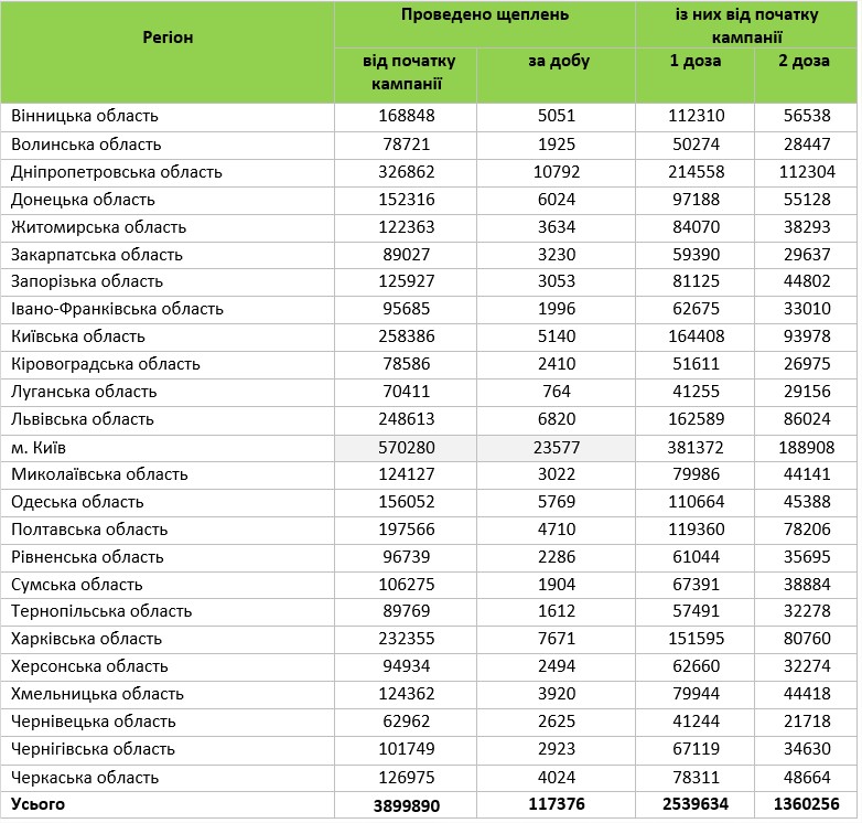 Наибольшее количество прививок сделали в Киеве — 23 577, наименьшее в Луганской области — 764.