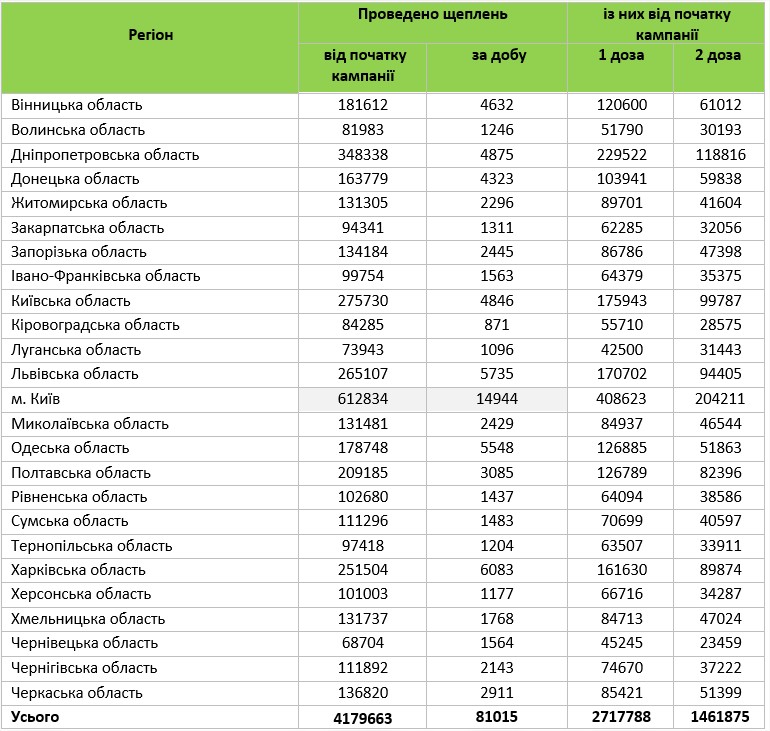 Наибольшее количество прививок сделали в Киеве — 14 944, наименьшее в Кировоградской области — 871.