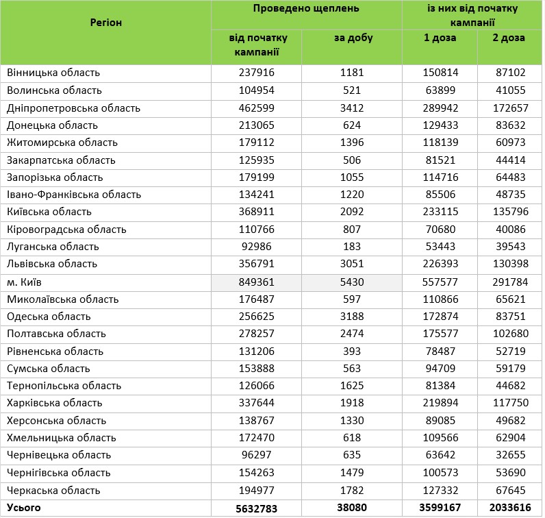 Всего с начала кампании было вакцинировано 5 632 783 человека. Из них получили первую дозу — 3 599 169, завершили вакцинацию — 2 033 616.