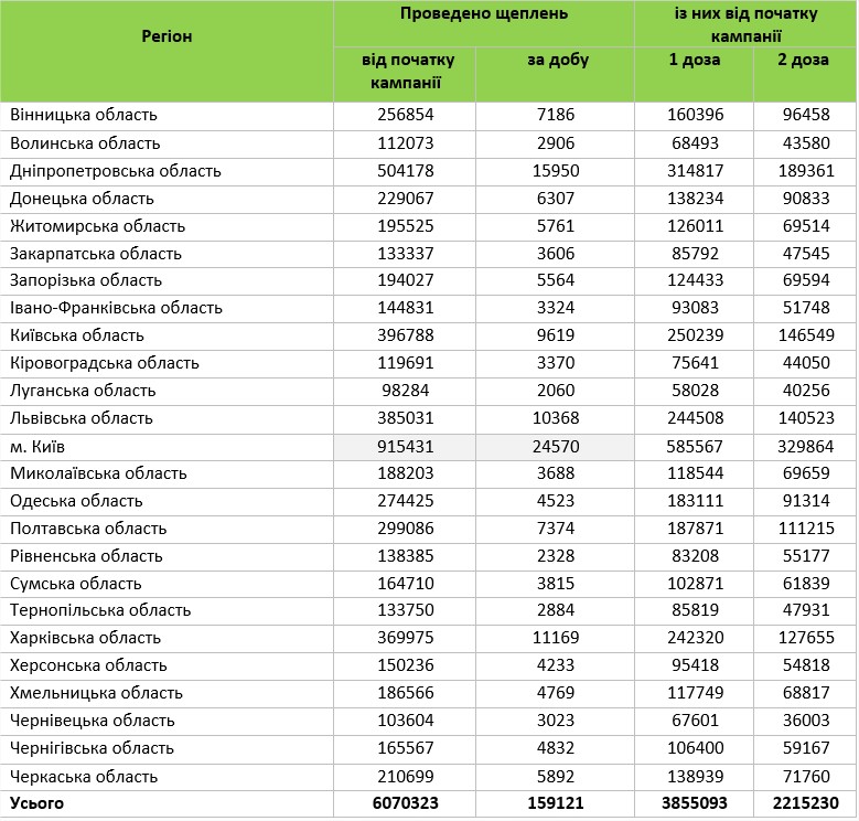 Наибольшее количество прививок сделали в Киеве — 24 570, наименьшее в Луганской области — 2060.