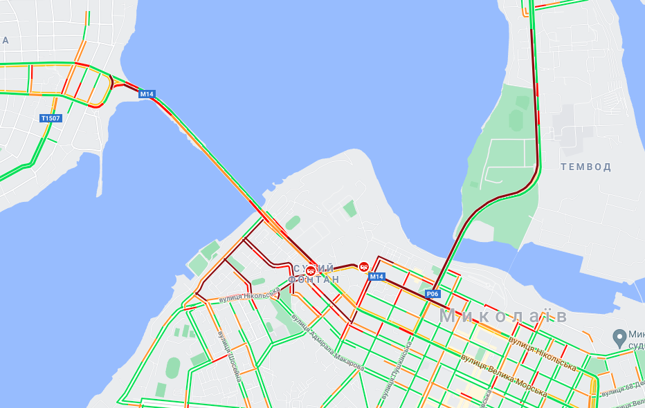 Согласно данным гугл-карт, движение также затруднено в районе Варваровского моста. В частности, на участках улиц Никольской и Большой Морской, Адмиральской, Террасной и по Бугскому бульвару.