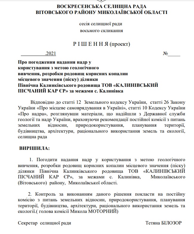 В документе указывается, что планируется предоставить участок за пределами села Калиновка в пользование ООО «Калиновский песчаный карьер» с целью геологического изучения, разработки месторождений песка.