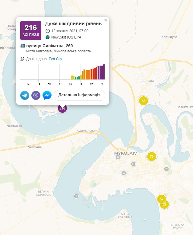 А вот в микрорайоне Матвеевка по улице Силикатная, 260 индекс качества воздуха достиг «очень вредного» для человека уровня. По данным ресурса «SaveEcoBot» во вторник, 12 октября, в этом районе зафиксирован показатель 216.