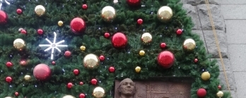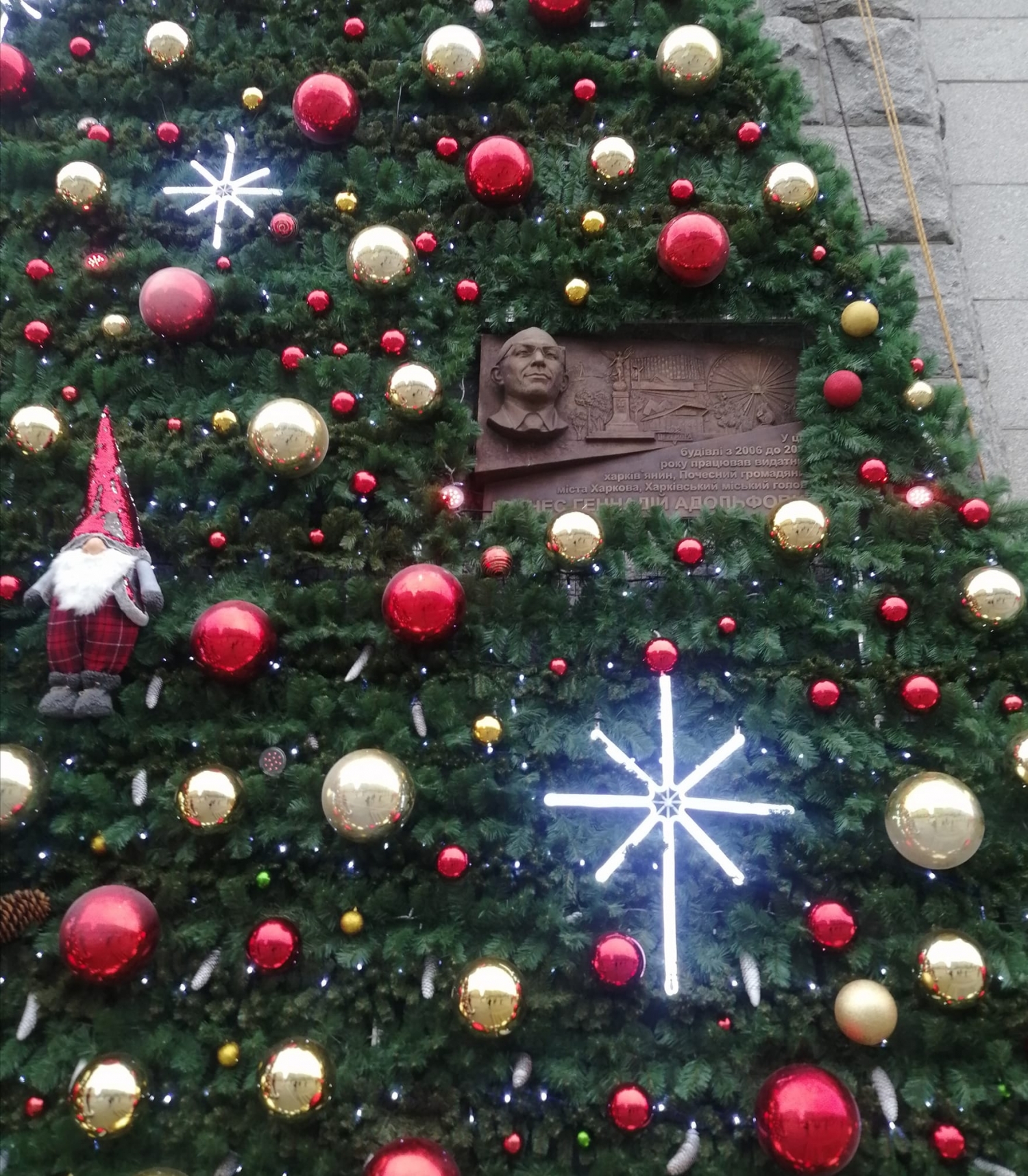 В Харькове праздничное дерево разместили таким образом, чтобы ветки обрамляли мемориальную доску покойному мэру Геннадию Кернесу.