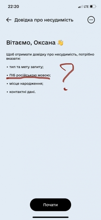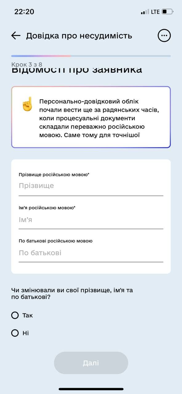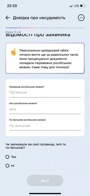 Для получения справки о несудимости «Дія» просит вводить данные на русском языке