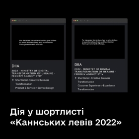 — Бренд «Дія» вошел в шортлист международного фестиваля креативщиков «Каннские львы 2022». Можем получить награды в двух категориях – Service Design и Experience Transformation, – рассказал Михаил Федоров.