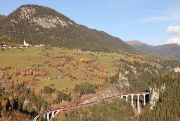 Компанія RhB запустила поїзд довжиною 1,9 кілометра, що складається зі 100 вагонів, уздовж маршруту Альбула-Берніна від Преда до Бергена.