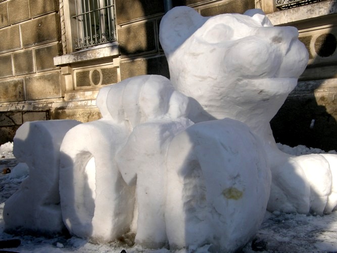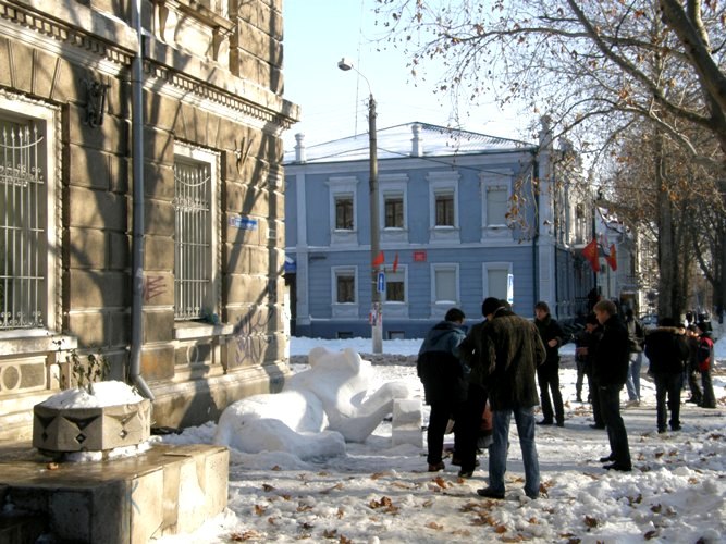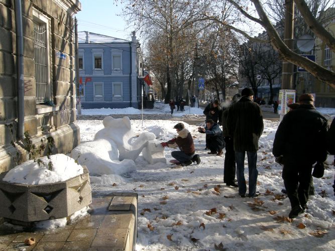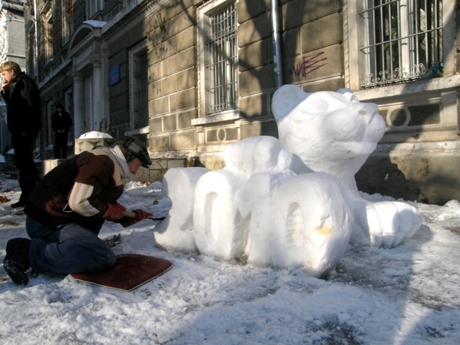 Вылепленный из снега тигр с надписью «2010» - дело рук сотрудника этого учреждения Дмитрия. Мастер уже третий день доделывает скульптуру. Сейчас работает над надписью «2010». Говорит – так хочет поздравить николаевцев с Новым годом – годом белого тигра.